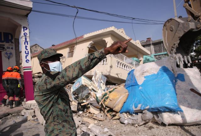 Un soldado haitiano y miembros de la Brigada Internacional de Rescate de Topos trabajan en la búsqueda y rescate de sobrevivientes en una zona afectada por el terremoto de hoy, en Les CayesEFE